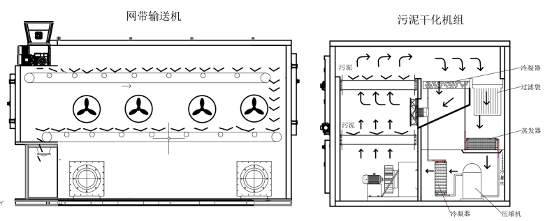 系统由污泥带式干化机、循环风除湿加热系统和热泵三部分组成。干化机和除湿加热系统通过风管连接,除湿加热系统和热泵通过水管连接,热泵系统同时提供热水冷水。